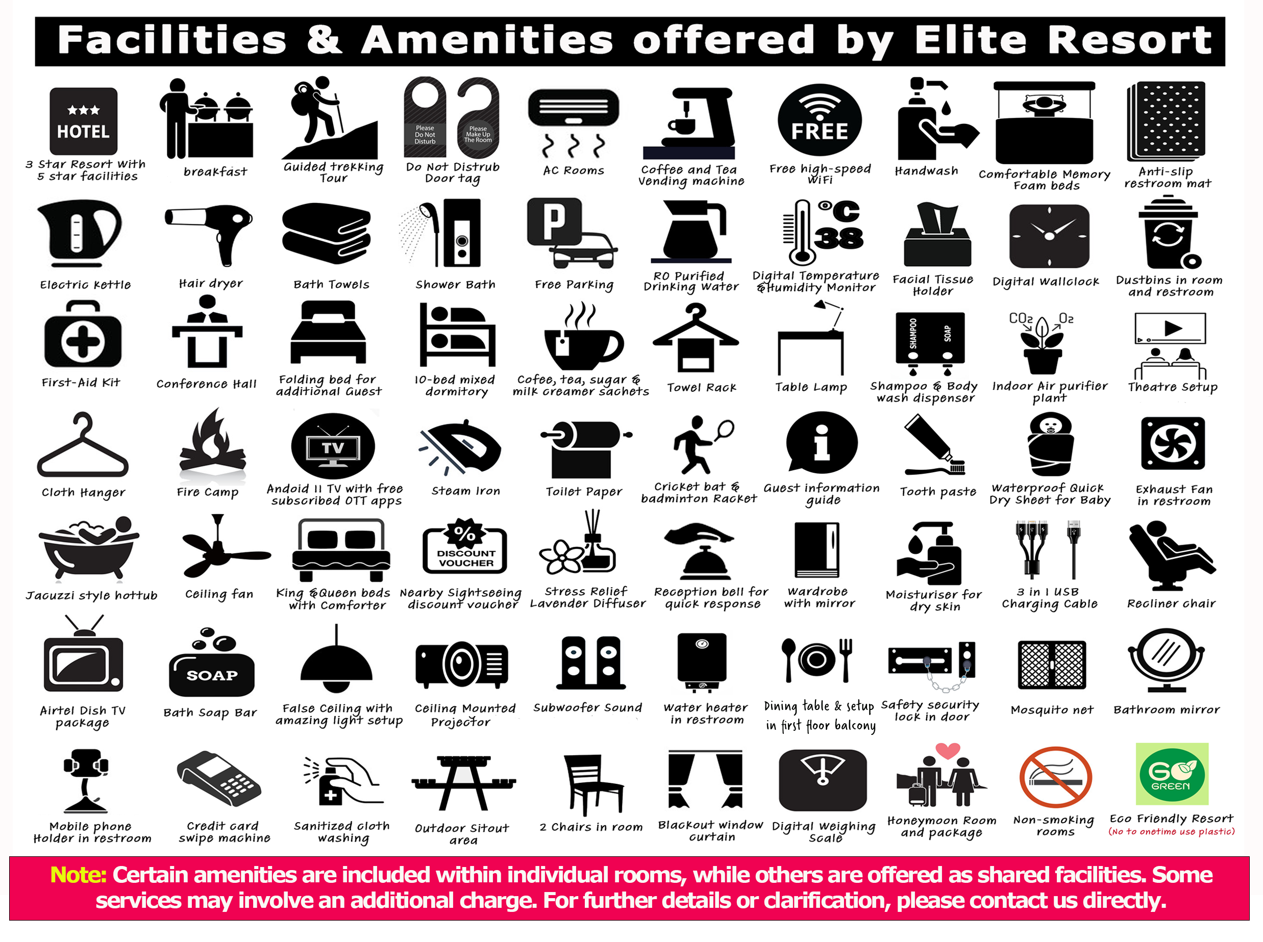 - Free toiletries (Body wash, Shampoo, Soap, moisturizer, etc..)
